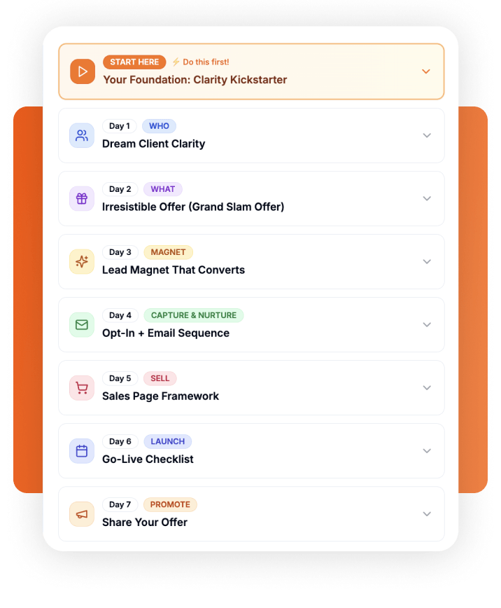 Instead of guessing, you get clear daily tasks, expert pro-tips, and direct "Shortcuts" to the playbooks you need to launch your offer with total clarity.